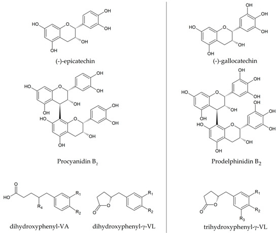 The type and composition of parent flavan-3-ols determine the type of PVLs that can be biosynthesized; for example, trihydroxy-PVL can be produced only when gallo/epigallocatechin are present in the matrix, as in tea [39], and it is expected that these can be produced after the intake of any food or beverage containing prodelphinidins (such as wine) (see Figure 1 for molecular structures).