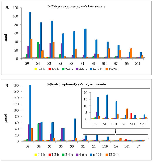 Urinary excretion of 5-(3′-hydroxyphenyl)-γ-VL-4′-sulfate (2) (A) and 5-(hydroxyphenyl)-γ-VL-glucuronide (4) (B) in the 11 study subjects (S1–S11) at different time intervals. 0–1 h: yellow bars; 1–2 h: red bars; 2–4 h: green bars; 4–6 h: purple bars; 6–12 h: blue bars; 12–24 h: orange bars. Subjects are shown in decreasing order of cumulative excretion in urine (AUC). Data were normalized according to urine volume.