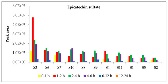 Excretion of epicatechin sulfate in urine in the 11 study participants (S1–11). 0–1 h: yellow bars; 1–2 h: red bars; 2–4 h: green bars; 4–6 h: purple bars; 6–12 h: blue bars; 12–24 h: orange bars. Subjects were shown in decreasing order according to the AUC in the range T1–T24.