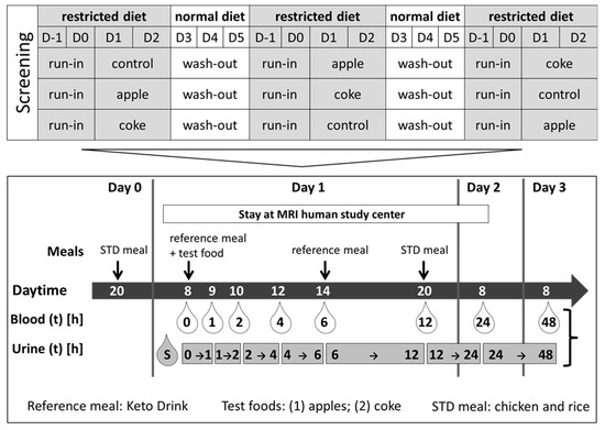 In the morning of the experimental day (Day 2), fasted subjects entered the study center, provided spot urine, and a cannula (Venofix Safety, Braun, Melsungen, Germany) was inserted into an antecubital vein. They stayed overnight until the next morning. Blood was drawn in supine position in S-Monovette tubes (Sarstedt AG, Nümbrecht, Germany) before and 1, 2, 4, 6, 12, and 24 h, respectively, after intake of the test foods. The test foods were consumed within 15 min. Urine samples were concomitantly collected in plastic containers at 0–1 h (T1), 1–2 h (T2), 2–4 h (T4), 4–6 h (T6), 6–12 h (T12), and 12–24 h (T24). Additionally, urine was collected by volunteers at home for the following 24 h (day 3; 24–48 h), stored in provided cooler bags, and immediately brought to the study center. In the evening of Day 1 (run in) and at Day 2 after 12 h, the participants received a standard meal ad libitum (steamed chicken with boiled rice, butter, salt). In addition, at day 2 (6 h), at least 200 mL of Keto-Drink was provided. The participants were instructed to refrain from fruit and fruit-containing food, as well as sugar-rich beverages and foods during the entire experiment (day 0 to day 3). Interventions were separated by a 6-day washout period.