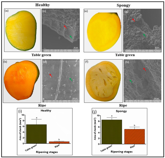 Figure 1. Cellular morphology of healthy and spongy mesocarp of mango fruit at table green and ripe stages. (a) and (b) represent the healthy mesocarp while and (e) and (f) represent spongy mesocarp at the above two stages. Representative scanning electron microscopic images of healthy (c and d) and spongy (g and h) mesocarp at two ripening stages are included adjacent to the respective fruit images. Red arrow indicates starch granules whereas green arrow indicates parenchyma cells. (i) and (j) histograms represent average area in mm2 covered with starch granules calculated from five different regions each of two respective SEM images of both the healthy and the spongy tissue, respectively at two stages. Normalization was done based on the scale represented on each image. Difference between ripening stage across tissue was significant (p ≤ 0.05) if lower case letters (a, b) above histogram are different.