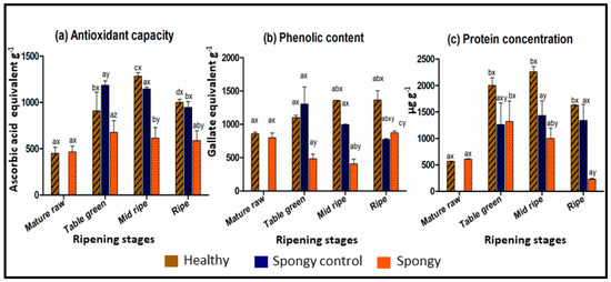 Figure 2. Biochemical assay. Average concentration of (a) antioxidant capacity in ascorbic acid equivalents per gram of tissue (AAE/g) (b) phenolic content in gallic acid equivalents per gram of tissue (GAE/g) and (c) protein concentration in µg/g of healthy, spongy control and spongy tissue mesocarp of Alphonso mango fruit at various ripening stages. Vertical bars represent standard error calculated from six biological replicates. Difference between the stages of each tissue set was significant (p ≤ 0.05) if lower case letters (a, b, c) are different. Difference between the tissue sets at each ripening stage was significant (p ≤ 0.05) if lower case letters (x, y, z) are different.