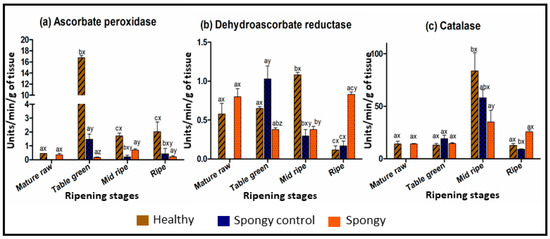 Figure 3. Enzyme assay. Average enzyme activity of (a) Ascorbate peroxidase (b) Dehydroascorbate reductase and (c) Catalase in units/min/g of healthy, spongy control and spongy tissue mesocarp of Alphonso mango fruit at various ripening stages. Vertical bar represents standard error calculated from six biological replicates. Difference between the stages of each tissue set was significant (p ≤ 0.05) if lower case letters (a, b, c) are different. Difference between tissue sets at each ripening stage was significant (p ≤ 0.05) if lower case letters (x, y, z) are different.