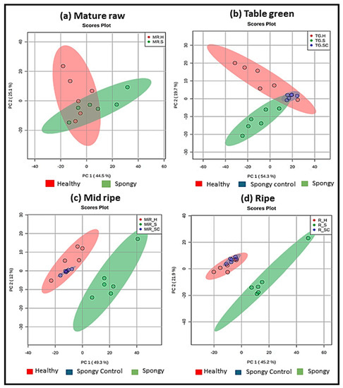 Figure 4. Stage specific metabolite feature variation. PCA Score plot using metaboAnalyst 4.0 distinguishing three tissue sets; healthy: H, spongy control: SC, spongy: S through four ripening stages (a) mature raw: MR, (b) table green: TG, (c) mid ripe: MiR, (d) ripe: R of mesocarp of mango. Total 10233 features from six biological replicates for each tissue set were considered.