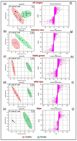 Figure 5. Pairwise metabolite feature comparison. PLS-DA Score plot (a to e) and corresponding S-Plot (f to j) obtained from metabolic profile considering healthy and spongy tissue at all the stages combined and four ripening stages (mature raw, table green, mid ripe and ripe) individually of the mesocarp of mango.