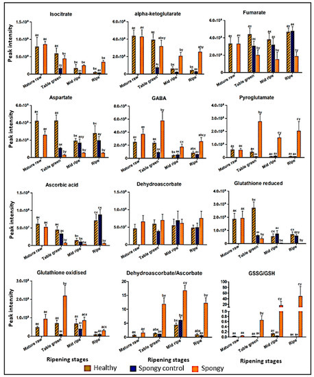 Figure 6. Metabolites involved in TCA Cycle, GABA shunt and Ascorbate glutathione cycle. Differential accumulation of metabolites in healthy, spongy control and spongy tissue within four stages of ripening (mature raw, table green, mid ripe and ripe) of Alphonso mango. Y-axis denotes the peak intensity values. Vertical bars represent standard error within six biological replicates. Difference between the stages of each tissue set was significant (p ≤ 0.05) if lower case letters (a, b, c) are different. Difference between tissue sets at each ripening stage was significant (p ≤ 0.05) if lower case letters (x, y, z) are different.