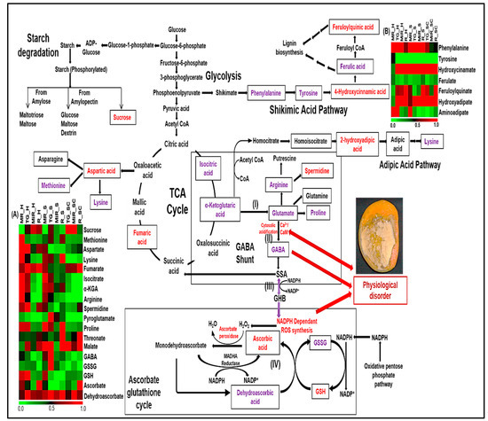 Figure 7. Probable pathways involved in spongy tissue formation. Ripening stage wise accumulation of each metabolite in all the three tissue sets is represented by heat map (MR: Mature raw, TG: Table green, MiR: Mid ripe, R: Ripe, H: Healthy, S: Spongy, SC: Spongy control). Heatmap (A) represents the putative metabolites from starch degradation, amino acid synthesis, TCA and ascorbate glutathione cycle whereas Heatmap (B) represents the metabolites from shikimic acid and adipic acid pathway. Metabolites identified in analysis are separated by box. Metabolites which are upregulated at the completely ripe stage of spongy tissue as compared to the healthy and the spongy control are represented in blue whereas downregulated metabolites are highlighted in red. Other metabolites are the components of respective pathways but are not identified in the current analysis. Black arrow indicates normal metabolic pathways whereas blue arrow (SSA to ROS synthesis) represents the probable metabolic variation which may induce physiological disorder. Pathways in which probable metabolic change occurs (GABA shunt and Ascorbate glutathione cycle) are highlighted separately. (Figure modified from [25]).