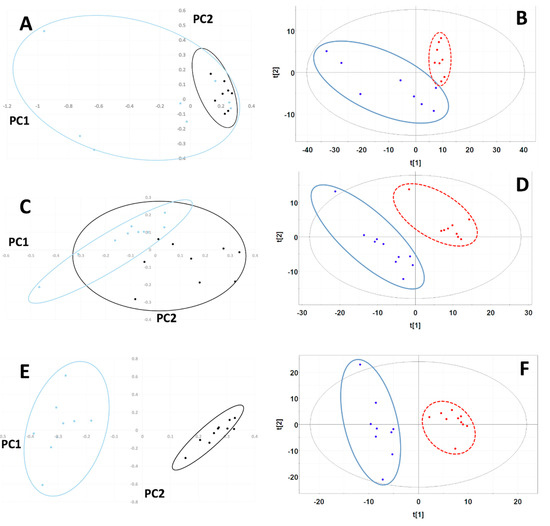 Principal Component Analysis (PCA) and Partial Least Squares-Discriminant Analysis (PLS-DA) scores plots for MiaPaCa-2, Panc-1 and AsPC-1 cell line comparisons. PCA scores plots using the first two principal components for comparisons between lyophilized (blue) and SpeedVac (black) samples from (A) MiaPaCa-2, (C) Panc-1 and (E) AsPC-1 cells. The 95% confidence intervals of the Hotelling’s T2 distributions are indicated by the overlaid ovals. PLS-DA scores plots computed using the first two principal components for (B) MiaPaCa-2, (D) Panc-1 and (F) AsPC-1 cell comparisons. Scores indicating lyophilized samples are colored blue and encircled by a solid blue oval line. Scores indicating SpeedVac samples are colored red and encircled by a dashed red line. The 95% confidence intervals of the Hotelling’s T2 distributions are indicated by the overlaid black solid oval lines.