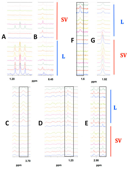 Highlighted spectral differences observed in MiaPaCa-2, Panc-1 and AsPC-1 cell extract comparisons depending on the drying method used for sample preparation. (A) Ethanol present in the lyophilized MiaPaCa-2 samples only. (B) Formic acid present in both groups of MiaPaCa-2 cell extracts but at higher concentration in SpeedVac samples. The bottom eight spectra were lyophilized samples (L) and the top eight spectra were SpeedVac samples (SV). (C) Leucine present only in the lyophilized Panc-1 samples. (D) Isoleucine present in both groups of Panc-1 cell extracts but at a higher abundance in the lyophilized samples. (E) Trimethylamine present only in SpeedVac dried Panc-1 samples. The bottom nine spectra were SpeedVac samples (SV) and the top 10 spectra were lyophilized samples (L). (F) N-methyl-α-aminobutyric acid present only in the lyophilized AsPC-1 samples. (G) Acetate was present in both groups but at a higher concentration in SpeedVac samples. The bottom nine spectra were SpeedVac (SV) samples and the top 10 spectra were lyophilized samples (L). Peaks of interest are boxed in each comparison of stacked spectra.