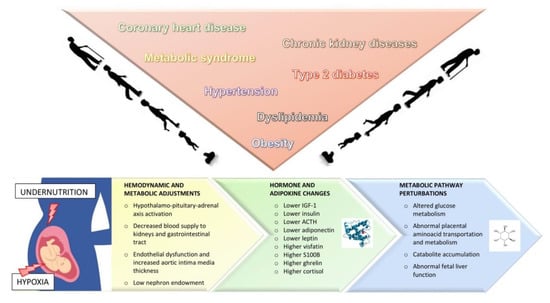 For SGA infants, the mortality risk is 2 to 4 times higher than for infants born at term or preterm but not SGA [10]. For growth-restricted infants, the immediate consequences at delivery may include hypothermia, hypoglycemia, hyperglycemia, persistent pulmonary hypertension, pulmonary hemorrhage, polycythemia, stillbirth, and intrapartum asphyxia [11]. Since IUGR is frequently associated with preterm birth, multisystem diseases of prematurity, such as impaired physical growth, or cognitive and motor development, may affect the intermediate and long-term outcomes of IUGR newborns. Several studies also suggest that an impaired fetal growth can predispose to certain major diseases later in life, including metabolic syndrome, obesity, coronary heart disease, hypertension, dyslipidemia, type 2 diabetes, and chronic lung and kidney diseases [12,13,14,15] (Figure 1). The assumption is that the fetus makes a number of hemodynamic and metabolic adjustments to cope with the adverse uterine environment, which may lead to permanent changes in the function and structure of several organ systems. Postnatally, when the environmental conditions change, the growth-restricted newborn’s response might be inadequate, further raising the risk of long-term consequences [16].