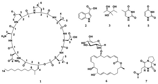 In our pursuit of isolation of natural compounds from marine sources [17,18,19,20], chemical investigation for the antimicrobial extract of Staphylococcus sp. No. [P-100826-4-6] derived, was carried out. This study led to discovery of a new natural cyclic depsipeptide (1) along with six known compounds; indol-3-carboxylic acid (2) [21], 1,5-dideoxy-3-C-methyl arabinitol (3) [22], thymine (4) [21], uracil (5) [23], cyclo (L-pro-L-omet) (6) [24], and macrolactin B (7) [25] (Figure 1). Therefore, structure identification of the isolated pure compounds 1–7 and their antimicrobial activity will be discussed.