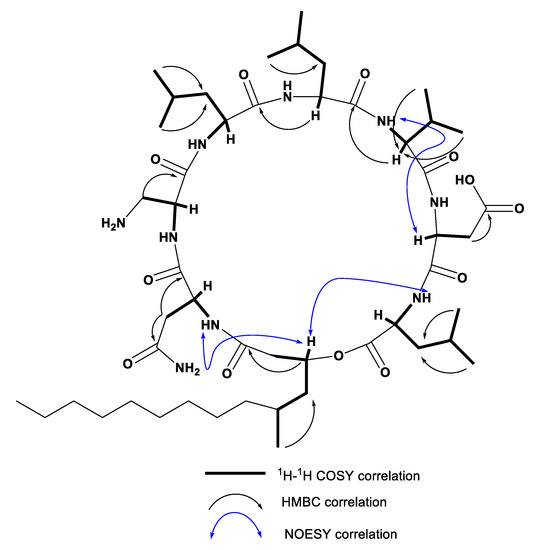 Compound 1 (Figure 1) was obtained as a white amorphous powder by several chromatographic procedures obtained from the fermented broth of Staphylococcus species. It gave a [M + H]+ peak in the (FABMS) at m/z 994.7 and (HRFABMS) elemental composition [M + Na]+ at m/z 1016.6396 (calcd for C49H87N9NaO12, 1016.6372, Δ+2.5 mmu) (Figures S1–S3) indicating 11 degrees of unsaturation. The 1H NMR spectrum of 1 (Table 1, Figure S4) with HSQC and HMBC spectral data confirmed the existence of 8 methine protons (C-H) [δH 5.64, 5.64, 5.05, 4.98, 4.90, 4.83, 4.70, 4.62, 1H each], 7 amide protons NH-C=O [δH 9.58, 9.48, 9.20, 8.91, 8.83, 8.75, 8.41, partially overlapped, 1H each], 10 methyl groups, among them 9 methyl doublets [δH 1.17, 1.13, 1.02, 0.96, 0.95, 0.93, 0.92, 0.85, 3H each, d, J = 6.6 Hz], one methyl triplet [δH 0.81, 3H, t, J = 6.9 Hz] and long methylene chain centered at δH 1.22 (12H, brs). The 13C NMR and DEPT spectra of 1 (Table 1, Figure S5) with HSQC and HMBC spectral data exhibited 49 signals, attributable to 10 carbonyl carbons [δC 175.6, 175.5, 174.8, 173,8, 173.6, 173.4, 172.5, 172.4, 172.0, and 171.7], 7 bearing nitrogen methines [δC 61.0, 55.0, 53.5, 52.7, 52.5, 52.5, and 51.5], one oxymethine [δC 72.5], 5 methines [δC 28.5, 25.4, 25.3, 25.1, and 24.9] 10 methyls [δC 23.6, 23.4, 23.2, 22.8, 21.8, 21.5, 21.5, 19.5, 18.7, and 14.4], 16 methylenes (Table 1). We could easily deduce that 1 was depsipeptide composed of 1 Val, 3 Leu, 1 Asn, 1 Asp, and 1 A2pr residues interlinked with 3-hydroxy-5-methyl fatty acid by analysis of HSQC, HMBC, COSY and NOESY (Figures S6–S9) correlations as shown in Figure 2. The sequence of amino acids in 1 was identified by NOESY and HMBC data analysis for 1 as in Figure 2. NOESY correlations found in 1 between NH protons and adjacent amino acids methine protons clearly identified the following amide bonds: Asp-CO/Val-NH (δH 4.83/9.48), HMTDA-CO/Asn-NH (δH 5.64/8.91), HMTDA-CO/Leu1-NH (δH 5.64/8.41). The connectivity between HMFA and Leu1 was also identified by NOESY correlation between α-methine proton HMFA and NH proton of Leu1 (δH 5.64/8.41) and Asn (δH 5.64/8.91). These data, together with HMBC correlations as shown in Figure 2, finally enable us to set up the structure of 1 as cyclo (-A2Pr-Asn-HMTDA-Leu1-Asp-Val-Leu2-Leu3-). FABMS data of 1 (Figures S2 and S3) supported the amino acid sequence of 1 as shown in Table 2. The amino acids absolute configuration of 1 was recognized by the reaction of Marfey’s reagent [26,27] with the crude hydrolysate followed by co-injection of standard amino acids using HPLC analysis. The hydrolysate was recognized to possess 3 L-Leu, 1 L-Val, and 1 L-Asp. The configuration of A2Pr and C-3 of HMTDA were proposed by cautions analysis of NOESY correlations, as shown in Figure 2. The NOESY correlation between β-proton (δH 5.64) of HMTDA and amide proton (δH 8.91) of Asn, between amide proton (δH 8.91) of Asn and α-proton (δH 4.90) of Asn, between amide proton (δH 9.20) of A2Pr and α-proton (δH 5.64) of A2Pr, between amide proton (δH 9.58) of Leu3 and α-proton (δH 4.62) of Leu3, between amide proton (δH 8.75) of Leu2 and α-proton (δH 4.98) of Leu2, between amide proton (δH 9.48) of Val and α-proton (δH 4.70) of Val, revealed that the configuration at A2Pr and C-3 of HMTDA have the configuration of L-Leu, L-Val, and L-Asp. Therefore, the final structure of 1 was lastly characterized as cyclo (2α, 3-diamino-propoincacid-L-Asn-3-β-hydroxy-5-methyl-tetradecanoicacid-L-Leu1-L-Asp-L-Val-L-Leu2-L-Leu3).