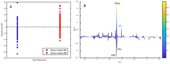(A,B) OPLS-DA score- and loading plots for separating samples with RIN above the median from below the median. Labeled metabolites:glycerophosphocholine (GPC), phosphocholine (Pcho), choline (Cho), creatine (Cr). The loadings are colored according to VIP-scores.