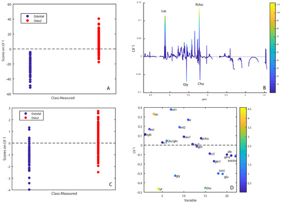 OPLS-DA score- and loading plots for separating samples from OsloVal and Oslo2. (A,B) show results from using spectral data. (C,D) show results using metabolite integration and after removing high-lipid samples. Variables in (D) are colored by VIP-score. Labeled metabolites: beta-glucose (bglc), ascorbate (asc), lactate (lac), tyrosine (tyr), creatine (cr1), glutamate/glutamine (glu/gln), myo-inositol (mI1), glycine (gly), myo-inositol (mI2), taurine (tau1), glycerophosphocholine (gpc), phosphocholine (pcho), choline (cho), creatine (cr2), glutamine (gln1), succinate (succ), glutamate (glu), glutamine (gln2), alanine (ala), total choline (totcho).