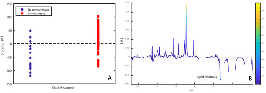 OPLS-DA correctly classified samples according to tumour cell content with a classification accuracy of 74.6% (p < 0.001, Figure 3A,B). The score- and loading plots showed that samples with tumour cells had lower levels of lipid residuals compared with samples without tumour cells.