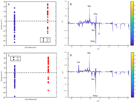 Score- and loading plots for prediction of oestrogen receptor status (A,B) and progesterone receptor status (C,D) respectively. Labeled metabolites are: Glycine (Gly), lactate (Lac), taurine (Tau), phosphocholine (Pcho), glycerophosphocholine (GPC), choline (Cho), and creatine (Cr). The loadings are colored according to Variable Importance in Projection (VIP) scores.