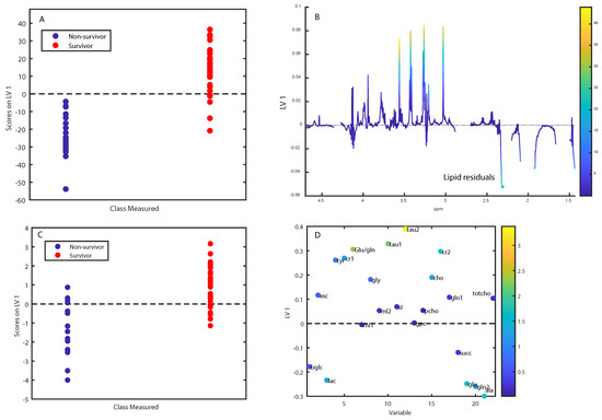 Five-year survival could not be predicted from spectral data, giving a classification accuracy of 57% (p = 0.18). Excluding samples with a high lipid content did not improve classification (accuracy = 56.0%, p = 0.25), neither did exclusion of the 24 patients who received adjuvant therapy (accuracy = 52.4%). Ten-year survival could be predicted from spectral data, however, only with a low accuracy (58.9%, p = 0.03), and this was reduced to 54.9% after removal of high-lipid samples. In patients who did not receive adjuvant therapy, spectral data could predict ten-year survival with an accuracy of 69.7% (Figure 5, p = 0.013). The score and loading plots show that lipid residuals comprised the most important discriminating metabolites, with non-survivors having more lipid signals and less metabolites. Using normalized integrals as prediction data to minimize the effect of lipid residuals gave a similar accuracy of 67.3%, with signals for lactate, glutamate, glutamine and alanine being higher in non-survivors (Figure 5C,D).