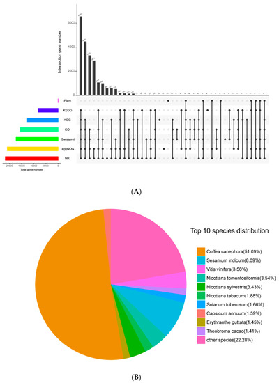 Pooled reads of both species were assembled de novo into a total of 32,740 unigenes with N50 of 2081 bp. All of the unigenes were annotated by aligning with public databases and obtained 21,743 (66.41%) significant hits in Nr; 17,328 (52.93%) in Swiss-Prot; 8211 (25.08%) in KEGG (Kyoto encyclopedia of genes and genomes); 12,995 (36.69%) in KOG (Clusters of orthologous groups for eukaryotic complete genomes); 20,918 (63.89%) in eggnog; 15,627 (47.73%) in GO (Gene Ontology); and 37 (0.11%) in Pfam databases. The best-match result of species distribution (Figure 1) gave top hits of 51.09% of unigenes to be from Coffea canephora, followed by Sesamum indicum (8.09%), Vitis vinifera (3.58%), Nicotiana tomentosiformis (3.54%), and Nicotiana sylvestris (3.43%). The 15,627 unigenes reflected in GO were assigned to one or more terms and categorized into 60 functional groups under three main partitions, namely, biological process, molecular function, and cellular component. Of the unigenes, 10,461 (66.94%) in the biological process partition fall under highly encoded proteins that are involved in the cellular process, followed by 9064 unigenes (58.00%) involved in the metabolic process, 4670 unigenes (29.88%) in biological regulation, and 4566 unigenes (29.21%) involved in response to stimulus.