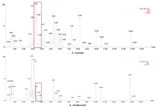 We performed a comparative metabolomics analysis between the two species based on the LC/MS (liquid chromatograph-mass spectrometer) data obtained from the individual species leaf. The results show that both of the A. venetum and A. hendersonii were rich in secondary metabolites, and more than 7500 kinds of components were detected and identified in the two species. Positive and negative ionization modes were used to evaluate the results, while the negative ionization mode being more selective and sensitive for presenting metabolomic profile with higher number of compounds and intensities [19] was chosen for further analysis. Upon comparison of observed m/z values with data of mass spectra of agrochemicals, pharmaceuticals, and physiologically active compounds (including drugs, steroid hormones, or endocrine disruptors) from mass spectral libraries NIST and WILEY (https://www.sisweb.com/software/ms/wiley.htm), several peaks were detected. In this study, the main peaks identified as flavonoids are indicated in Figure 2 using the red box (3.3139, delphinidin; 3.3143, quercetin 3-(6’’-malonyl-glucoside); 3.31393, quercetin 3-galactoside; 3.31393, kaempferol 3-(6-acetylgalactoside); 3.31435, isoorientin; 3.48303, Luteolin; 3.48795, kaempferol 3-O-arabinoside; 4.0666, kaempferol; 3.4302, rutin; 3.55095, tamarixetin). Other flavones or anthocyanins detected were: 11.85368, pelargonidin; 11.26885, malvidin; 10.82683, peonidin; and 10.37761, luteolin. When taking the contents of the flavonoid constituents into account, it was found that there indeed existed quite a few differences between the two species. As is known, flavonoids may promote desirable and non-desirable physiological effects in humans or animals, and their biological activity is largely determined by the concentrations. This comprehensive and unique phytochemical profile study revealed the diversity of secondary metabolites (especially flavonoids) between A. venetum and A. hendersonii; correlation studies between potential markers and biological activities assays need to be conducted in the future.