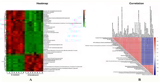 Heatmap (A) and correlation (B) among the top 50 differentially accumulated metabolites between A. venetum and A. hendersonii. The content of each metabolite was normalized to complete linkage hierarchical clustering. Each example in (A) is visualized in a single column and each metabolite is represented by a single row. Red indicates high abundance, whereas low relative metabolites are shown in green. The red and blue color in (B) indicate the positive and negative correlations, respectively.