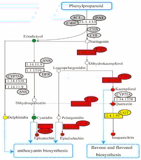 The subsequent reactions in the flavonoid biosynthesis pathway are from naringenin to dihydroflavonol, anthocyanins, flavonols, or other flavonoids with the different enzymes. Among these key enzymes, two flavonol 3-hydroxylase (F3H)-encoding genes (ID: DN13255 and DN9170), three anthocyanidin reductase (ANR)-encoding genes (ID: DN11675, DN11945, and DN20760), five flavonoid 3-O-glucosyltransferase-encoding genes (ID: DN11850, DN14334, DN16440, DN19250, and DN6934) were identified, and their expression levels were significantly up-regulated in A. venetum rather than in A. hendersonii. Other differentially expressed genes, such as kaempferol 3-O-beta-D-galactosyltransferase (ID: DN10026) and leucoanthocyanidin reductase (ID: DN11675) encoding genes, were also identified with a log2 fold change value of 5.08 and 1.65 in A. venetum vs. A. hendersonii samples, respectively. The content of corresponding products (kacmpferol, quercetin, isoqucrcitrin, epicatechin, and epiafzelechin) in A. venetum were also higher than in A. hendersonii. Further confirmation by quantitative PCR (qPCR) analysis shows that all of the selected genes had the same expression pattern, revealed by the differential analysis results from high throughput sequencing (Table S1). The positive correlation between the transcript level and total flavonoid content (Figure 4) obtained in this study indicates that accumulation of flavonoids was accompanied by the induction of flavanone 3-hydroxylase, anthocyanidin reductase, and flavonol 3-O-glucosyltransferase.