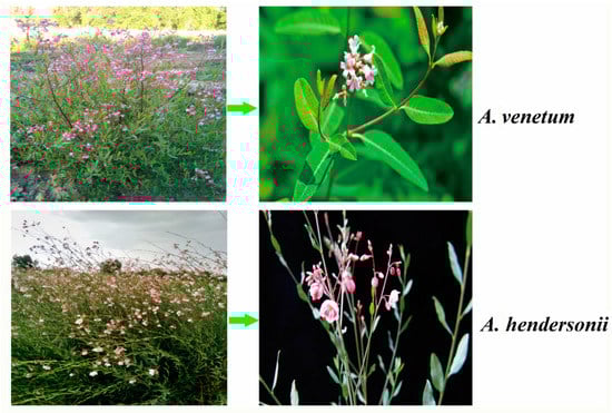 Apocynum, commonly known as kendir or Luobuma since pre-historic times due to its excellent quality fiber, is a genus in the Apocynaceae family used as a medicine and source of fiber. They are considered native to a large number of countries in northern and south Eastern Europe, northern America, and Asia. Although there is much divergence in their taxonomy, there exist mainly two species, Apocynum venetum and Apocynum hendersonii (also called Apocynum pictum) in China distributed widely in the northwest and the coast of the Yellow Sea [1,2]. Both species are eco-economic perennial rhizomatous plants with high stress resistance and economic value, with rhizomes extending up to 5–6 m horizontally underground, and adapted to survive in extreme environments of low rainfall, saline and alkaline deserts, river banks, alluvial plains, and the Gobi desert [3].