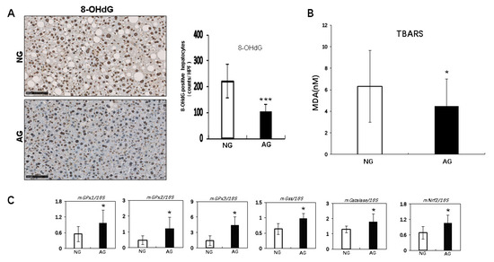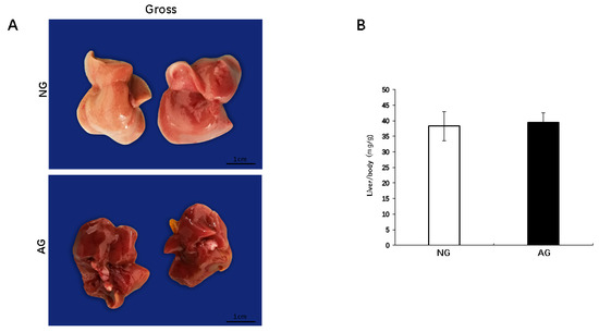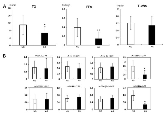 The hepatic triglyceride (TG) and free fatty acid (FFA) levels in liver were significantly lower in AG mice than in NG mice (TG: AG 6.7 ± 3.5 mg/g vs. NG 11.0 ± 5.2 mg/g; p < 0.05, n = 17; FFA: AG 0.15 ± 0.15 mEq/g vs. NG 0.4 ± 0.2 mEq/g; p < 0.01, n = 17). However, the liver T-cho levels were not significantly different between AG and NG mice (Figure 4A).