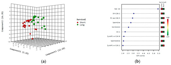 With the aim to propose a signature of metabolites that may identify patients with poor prognoses, the following three selection criteria were applied for the inclusion of metabolites based on differences between short and long survival: (1) metabolites with a statistically significant p value (<0.05) according to the Mann–Whitney U test; (2) Metabolites with a fold change >2; and/or (3) Metabolites with a VIP score >2.0 based on the PLS-DA.