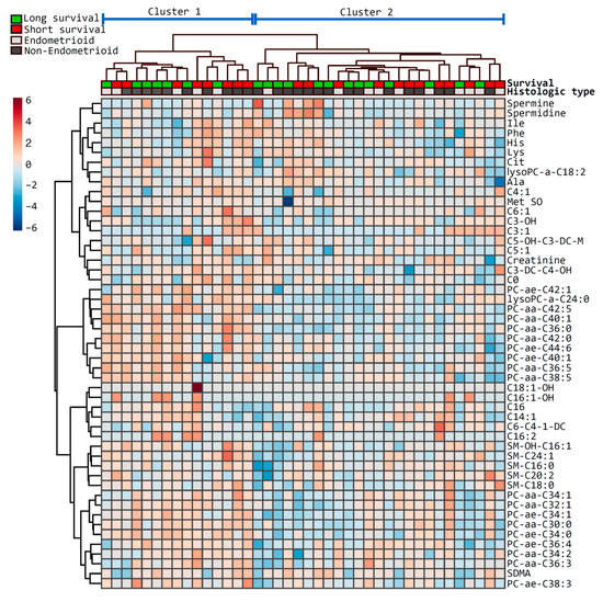 Heatmap of the top metabolites differentially presented in patients with short and long survival. The heatmap illustrates the most relevant metabolites ranked by t-test according to short (red) and long (green) survival as defined on top. Histologic type is indicated below the survival (endometrioid, light grey; non-endometrioid, dark grey). Metabolites are clustered along the vertical axis, whereas subjects are clustered along the horizontal axis (main clusters are indicated on top).