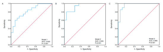 Receiver operating characteristics (ROC) curves under three modeling methods. Multivariate ROC analyses based on the metabolites in Models 1–3, according to survival. Model 1 is based on the metabolites methionine sulfoxide (Met SO), serotonin, spermine, hydroxypropionylcarnitine (C3-OH), PC-aa-C36:5, and SM-C20:2 (AUC 0.820, 95% CIs 0.692–0.948) (A). Model 2 is based on all metabolites in Model 1, as well as spermidine, butenylcarnitine (C4:1), lysoPC-a-C18:2, and lysoPC-a-C24:0 (AUC 0.935, 95% CIs 0.865–1.000) (B). Model 3 is based on all metabolites in Models 1 and 2, as well as aspartic acid (Asp), asymmetric dimethylarginine (ADMA), hexose H1, and PC-ae-C30:1 (AUC 0.965, 95% CIs 0.913–1.000) (C). p values are based on the asymptotic 2-tail significance.