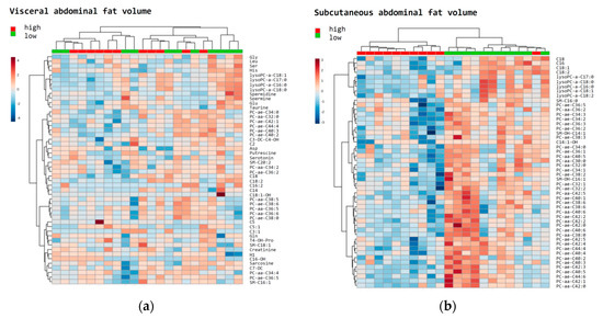 Heatmaps of the top metabolites in relation to fat distribution. The most relevant metabolites ranked by t-test were used to discriminate a total of 22 patients according to high (red: above median) vs. low (green: below median) visceral abdominal fat volume (cm3) (a); and subcutaneous abdominal fat volume (cm3) (b).