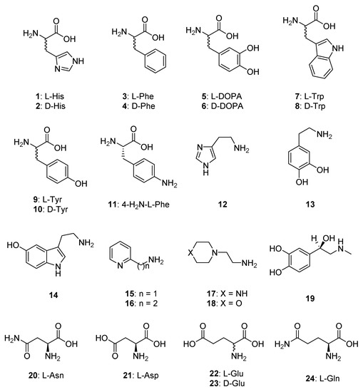 - Many of the compounds investigated here showed medium potency efficacy as EhiCA activators, with KAs ranging between 16.5 and 25.6 µM. They include L-Phe, L-DOPA, L-adrenaline, L-Asn, L-Asp, L-Glu and L-Gln. It may be observed that there are no remarkable differences of activity between the pairs L-Asp/L-Asn and L-Glu/L-Gln, whereas D-Glu was more ineffective compared to L-Glu. This is in fact the exception, as for other L-/D-enantiomeric amino acids investigated here, the D-enantiomer was the most effective activator (see later in the text).