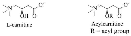 Acylcarnitines are esters of l-carnitine and fatty acids (Figure 1). They are a large class of metabolites that are members of the non-protein amino acid family. According to the Human Metabolome Database, there may be more than 1200 fatty acids in the human body [,]. Therefore, it is inferred that the number of acylcarnitines that may be formed with these fatty acids is very considerable. Similar to fatty acids, acylcarnitines are also differed by length of the acyl groups, often categorized as short, medium and long-chain acylcarnitines (simply marked as SCACs, MCACs and LCACs). Acylcarnitines are zwitterionic compounds, containing a carboxyl group and a quaternary ammonium group in the molecule (Figure 1).
