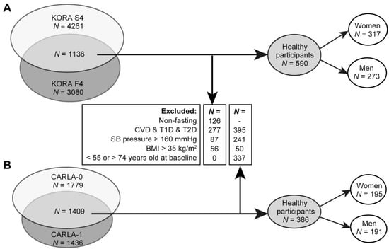 Flow diagram showing the inclusion and exclusion procedures of the study population in KORA (A) and in CARLA (B). CVD, cardiovascular disease. T1D, type 1 diabetes. T2D, type 2 diabetes. SB, systolic blood. BMI, body mass index.