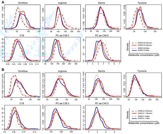 Density plot showing the distribution of metabolite concentration of both women and men in two time-points in KORA S4 and F4 (plot A) and in CARLA-0 and CARLA-1 (plot B). C18, octadecanoylcarnitine. PC aa, diacyl phosphatidylcholine. PC ae, acyl-alkyl phosphatidylcholine.