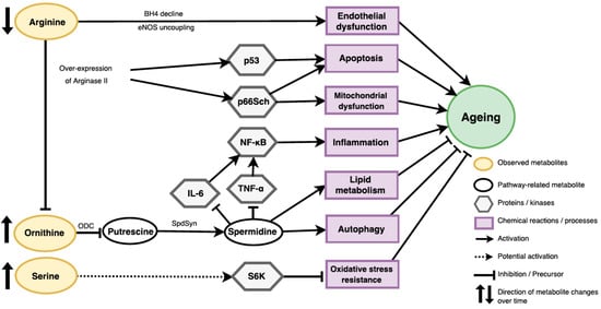 Based on literature search and the Kyoto Encyclopaedia of Genes and Genomes (KEGG) database, we found that three amino acids, ornithine, serine and arginine, are involved in different pathways related to the ageing processes. Their metabolic pathways and/or cell-signalling functions are shown in Figure 3.