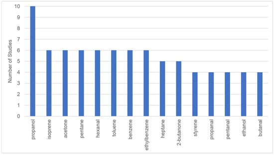 Many target subjects for disease diagnostic studies often have more than one medical condition. These diseases will also change the VOC profile and confound the biomarker discovery for the targeting disease. Most studies recruited healthy subjects as a control group [29,41,50], while a few studies recruited subjects with similar comorbidity as a control group [44]. The variances in the choice of control groups contribute to the inconsistencies across the different studies.