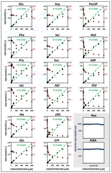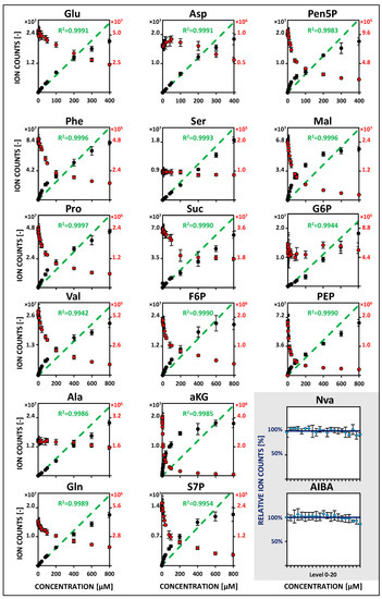 HILIC-based QQQ-MS/MS studies in MRM mode of metabolite-specific signal responsivities using U13C isotope dilution (IDMS). Metabolite-specific calibration curves in the extended concentration range (5/10 nM to 400/800 µM, 5 µL sample injection). Mean values of non-labeled reference standards (black) and analogous U13C-isotopologues (red) are based on four freshly prepared (24 h) replicates (n = 4). Linear regression of IDMS normalization (green) is shown with associated correlation coefficients (R2 > 0.99). Non-labeled internal standards (blue) are additionally considered for monitoring of instrumental fluctuations (n = 4). See Table S5 for related regression parameters. See Tables S1–S4 for the full names of abbreviated metabolites.