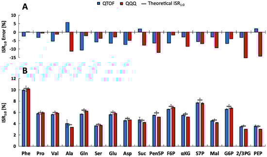 Evaluation of m+1/m+0 Isotopologue Ratios (ISR1:0). (A) Experimental metabolite-specific mean ISR1:0 values (n = 5) determined by the QTOF-HRMS (blue) and QQQ-SIM (red) systems in defined non-labeled mixtures of reference standards and theoretical calculated ISR1:0 (grey) [29]. (B) Corresponding relative ISR1:0 errors of the experimental compared to the theoretical ratio for both systems. See Tables S1–S4 for the full names of abbreviated metabolites.