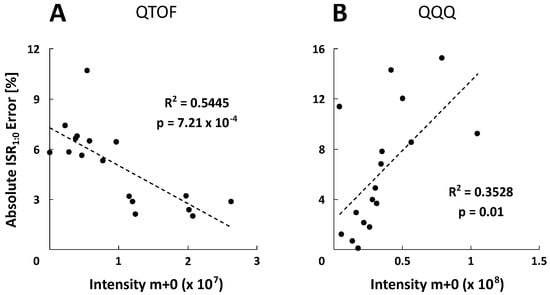 The experimental ISR1:0 mean standard deviations of 3.21 ± 4.00% and 1.26 ± 0.66% were obtained for all selected metabolites and five measurements (n = 5) using the QTOF- (MS mode) and QQQ-system (SIM mode), respectively. Based on the variability of the natural isotopic background, theoretical ISR1:0 showed similar standard deviations about 5%. For further investigation, error calculations were performed resulting in relative ISR1:0 errors. Figure 3A shows that the majority of metabolite-specific ISR1:0 errors are negative, illustrating a systematic underestimation of the experimental isotope ratios. However, the average absolute ISR1:0 error value of all metabolites is in the range of the recommended 5% isotope abundance error [22] with 5.03 ± 2.30 % for QTOF and 6.26 ± 4.72 % for QQQ analysis, confirming a sufficient spectral accuracy of both MS platforms. Since the individual ISR1:0 error profiles of metabolites differ significantly between QTOF and QQQ detection, an in-depth analysis was performed to identify data correlations. Remarkably, both systems exhibit an opposed roughly linear correlation between ISR1:0 errors and signal intensities of corresponding monoisotopic ions (m+0) (Figure 4). The QTOF system showed decreased ISR1:0 errors at higher intensities (R2 = 0.5445, p < 7.21 × 10−4) and the QQQ system exhibited decreased ISR1:0 errors at lower intensities of the m+0 ions (R2 = 0.3528, p < 0.01), pointing towards different underlying mechanisms of uncertainty.