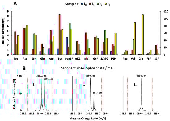 Conformity analysis of relative isotopologue abundances (RIA). (A) Total RIA deviations between the QTOF-HRMS and QQQ-SIM 13C-labeled datasets (t0 < 0 s, t1 = 28 s, t2 = 52 s, t3 = 10 h) are shown as bar plots for all metabolites. See Tables S1–S4 for the full names of abbreviated metabolites. (B) High-resolution QTOF mass spectra (tR = 22.4 min) of 13C-labeled C. glutamicum metabolite extracts (t1–t3) showing the monoisotopic ion cluster of sedoheptulose 7-phosphate (m/z 289.0338 and m/z 289.0324) and an adjacent ion cluster identified as argininosuccinic acid (m/z 289.1160 and m/z 289.1159). Dashed red lines indicate the mass resolution of the QQQ-SIM system (m/z 0.3).