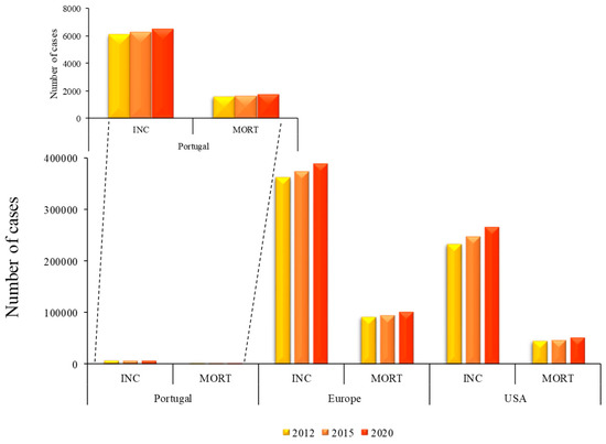 BC incidence and mortality rates in Portugal, Europe and USA from 2012, 2015 and expected rates for 2020. Data available at IARC. Legend: INC: incidence; MORT: mortality.