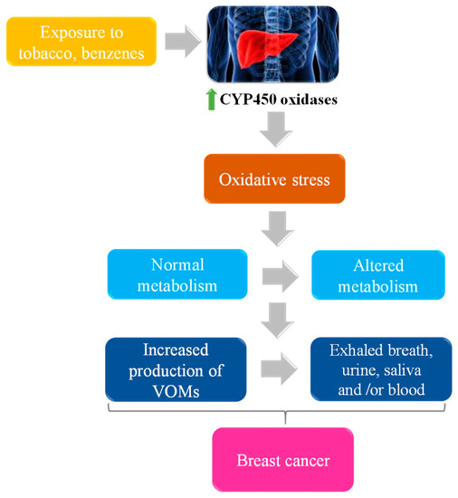 Regarding exhaled breath a less explored biological sample in terms of BC diagnostic purpose. In a study performed by Martinez-Lozano Sinues et al. [48] who developed a pilot study to identify cancer–related volatile profile in exhaled breath of BC patients. Concerning exhaled breath and the possible mechanisms involved in the production of endogenous VOMs, in Figure 3 is represented a schematic illustration about the possible pathways.