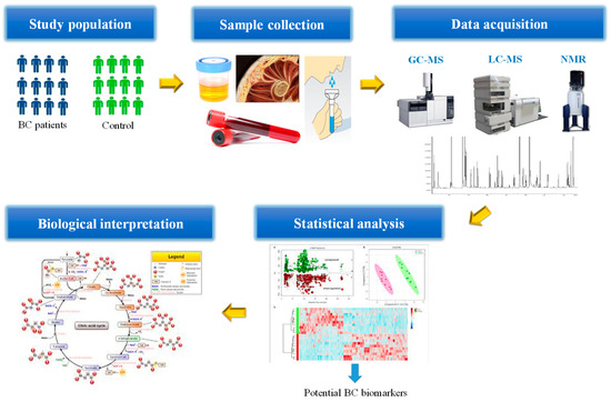 The type of approach chosen will determine the experimental design, sample preparation, and which analytical techniques can be used to obtain the results. Both targeted and untargeted follow the similar pipeline. Briefly, the study design includes the population that will be part in the study and also the determination of the conditions that are relevant for the hypothesis in investigation, namely the sample size, randomization (as a study design consideration), storage (as a sample handling issue), freeze/thaw cycles and timing during sample preparation are the most common factors that should be taken into account to guarantee reproducible and successful experiments minimizing variability. There are three main analytical platforms frequently used in metabolomic studies, which include mass spectrometry (MS) and nuclear magnetic resonance (NMR) spectroscopy [26]. Moreover, after data acquisition, the obtained dataset, normally is subjected to statistical analysis (univariate and multivariate methods) to find significant variations that allow the discrimination of patients with a specific disease (in this case, BC) from a control group [27]. The most common approaches for the identification of important metabolites comprise the application of unsupervised methods, such as, principal component analysis (PCA), hierarchical cluster analysis (HCA), as well as supervised methods, like partial least squares discriminant analysis (PLS-DA), random forest (RF) and support vector machines (SVM) [26,28]. A training set is used to construct the multivariate analysis models (e.g., PCA or PLS-DA), followed by an external validation set to predict the new cohort of samples using the model constructed with the training model. Finally, the putative biomarkers can be placed in metabolic networks to allow the biological interpretation or which pathways are up- or down-regulated.