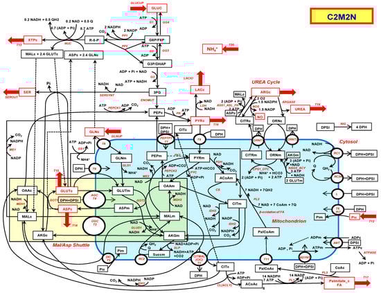 The central carbon metabolic with nitrogen model (C2M2N). Possible entries and outputs are indicated by red arrows. The corresponding metabolites are in red. The abbreviated names of the reactions are indicated in red italic along the arrows of the reactions. The mitochondrion is in blue and the malate–aspartate shuttle in light brown. Dotted lines link identical metabolites duplicated for the sake of presentation.