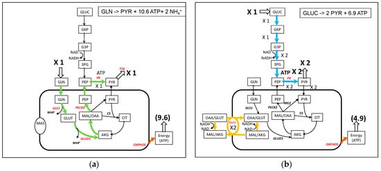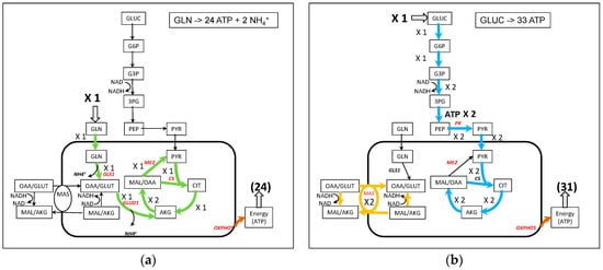 Energy production is symbolized by ATPASE activity which is the objective function in this section. About 24 molecules of ATP can be synthesized from 1 molecule of glutamine without any other synthesis (Figure 2a and Figure S2a). One molecule of glutamine enters the mitochondria and then the Krebs cycle as α-ketoglutarate (AKG) to double the flux to malate. One molecule of malate generates pyruvate (through ME2) and then acetyl-CoA, which will condense with the OAA derived from the remaining molecule of malate, to generate citrate and a canonical TCA cycle continue in the usual direction with a flux equal to 1. It is very similar to the glycolysis-derived pyruvate TCA cycle except that, with glutamine, there is no need for NADHc reoxidation. However, ATP synthesis from glutamine necessitates the synthesis of pyruvate either inside or outside mitochondria (see the discussion in [,] and is accompanied by a release of ammonia. In the same conditions, one molecule of glucose usually allows the synthesis of 33 ATP molecules at the most (Figure 2b and Figure S2b). In both cases, the activity of respiratory chain is mandatory in order to reoxidize the NADHm produced by the TCA cycle and to get the maximum rate of ATP synthesis.