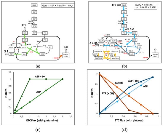 A simplified representation of aspartate synthesis from glutamine (a) and glucose (b). Note that in (b), the flux through T4 and GOT 2 can be split in a malate–aspartate shuttle (MAS) with a flux of 2 and in a 1.85 flux through T4 corresponding to aspartate output, i.e., T4 net flux is 3.85. See the complete representation of the glutamine- and glucose-derived aspartate in Figure S4a,b. (c): ETC inhibition (RC34 is inhibited) of aspartate synthesis from glutamine in the absence or presence of the dehydrogenase DH which reoxidizes NADHc. (d) ETC inhibition (RC34 is inhibited) of aspartate synthesis from glucose in the absence or presence of the dehydrogenase DH which reoxidizes NADHc. The ETC inhibition leads to lactate release, or pyruvate release in the presence of DH.