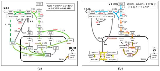 Aspartate is an amino acid which participates in many reactions, particularly in nucleotides synthesis and appears at a high level in the biomass. Due to its low concentration in blood, aspartate synthesis is crucial for cell survival [,,,,]. Aspartate synthesis from glutamine (Figure 4a and Figure S4a) involves aspartate amino transferase (GOT) with oxalacetate (OAA) synthesized in the last part of TCA cycle from AKG coming from the glutamine-derived glutamate. Aspartate is carried out of the mitochondria through the glutamate–aspartate carrier (T4). Glutamate is recycled outside the mitochondria by the glutamate/H+ carrier (T9). The maximal yield from one glutamine is one aspartate and 7.6 ATP.