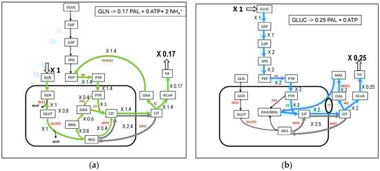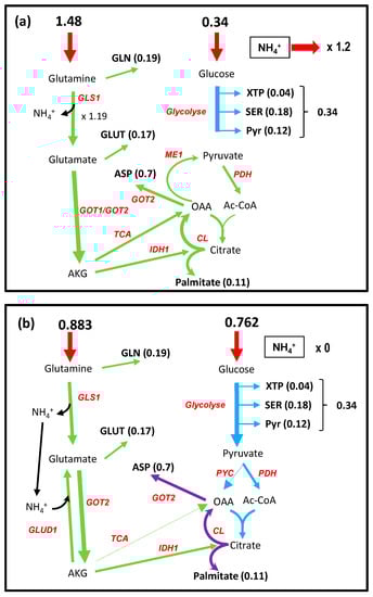 Fatty acids (FA) synthesis is an important pathway in proliferating cells, especially for phospholipids syntheses. In the case of palmitate synthesis, 0.17 palmitate molecule can be synthesized from one molecule of glutamine and because this is rather energy consuming, no ATP molecule is synthesized (Figure 6a). The synthesis occurs through ATP citrate lyase (CL) fed by citrate synthesized in TCA cycle. The glutamine-derived AKG flux in the TCA cycle (flux = 1) is split between the reductive pathway giving directly citrate by inversion of IDH3 (flux = −0.4) and the oxidative pathway through malate and oxalacetate (flux = 0.6) and pyruvate coming from the recycling of OAAc, product of CL in the cytosol. To these fluxes is superimposed a cycle involving IDH1 and IDH3 in order to transform NADHm into NADPHc necessary for the synthesis of fatty acids (flux = 2.4 in gray in Figure 6a and Figure S6a) giving a net reductive flux of IDH3 equal to −2.8. NADPHc could have been made by the malic enzyme (ME1) in the cytosol but this occurs with a slightly lower yield (0.16 PAL per 1 glutamine). In [], the authors showed that 60% of NADPH is synthesized from glutamine by malic enzyme and that the pyruvate produced is excreted as lactate. We do not observe a release of lactate in our models because, in the absence of glucose, there is no excess of carbon and pyruvate enters the mitochondria to replenish the TCA cycle in the classical anaplerotic way. The authors also observed a G6PDH flux (PP1) of the same order as the glutaminolysis flux, demonstrating that several sources of NADPH can be operating in vivo at the same time.