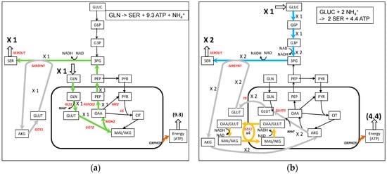 We have already studied the different yield in serine synthesis on different substrates with our core model []. The synthesis of serine from glutamine is represented in Figure 7a. It involves the synthesis of PEP as in pyruvate synthesis, but here PEP is used to make 3PG, a serine precursor. The glutamate used in the transamination reaction is recycled from the AKG produced and the NADH produced by the 3-phosphoglycerate dehydrogenase reaction is reoxidized with MDH1. In addition, 9.3 ATP can be synthesized. With glucose as a carbon substrate, 3PG is synthesized directly from glucose via glycolysis (Figure 7b). However, the work of Hanson in rats demonstrates that “pyruvate entry into the gluconeogeneic pathway is the major route for serine biosynthesis” [,]. It is difficult to obtain this pathway from glucose in C2M2N. This could indicate that in the case of this work, serine is mainly synthesized from other sources than glucose (glutamine or other amino acids, for instance). The yield of serine synthesis with glucose as a carbon substrate can reach 2 molecules of serine per molecule of glucose with 4.4 ATP molecules produced. 4 NADHc are generated which requires a flux of 4 in the MAS (Figure 7b).